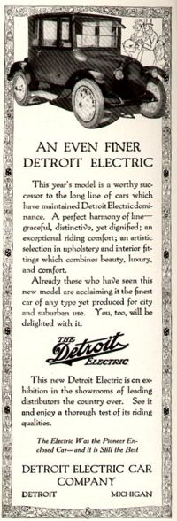 1907 ല് ആണ് ഡിട്രോയിറ്റ് ഇലക്ട്രിക്(Detroit Electric) എന്ന വൈദ്യുത വാഹനം പുറത്തിറങ്ങിയത്. ഡിട്രോയിറ്റ് ല് നിന്നുമുള്ള Anderson Electric Car Company യുടെ വൈദ്യുത വാഹന ബ്രാന്റ് ആണത്. ഒരു ഫുള് ചാര്ജ്ജില് 130 km പോകുന്ന ഈ കാറിന്റെ കൂടിയ വേഗത 32 km/hr ആയിരുന്നു.