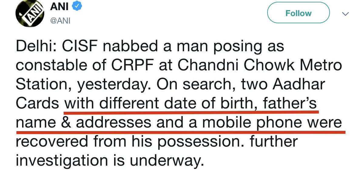Delhi: CISF nabbed a man posing as constable of CRPF at Chandni Chowk Metro Station, yesterday. On search, two Aadhar Cards with different date of birth, father’s name & addresses and a mobile phone were recovered from his possession. further investigation is underway. pic.twitter.com/ZAG21znwLl
